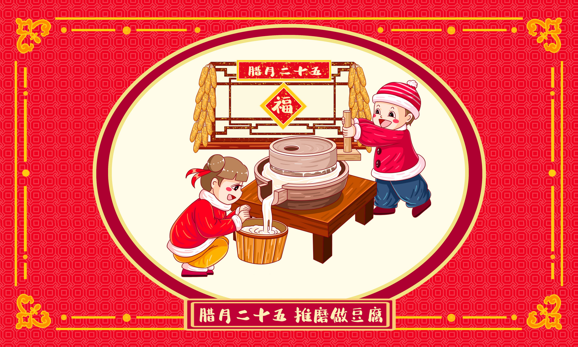 民諺稱:“臘月二十五,磨豆腐。"一些地方還有在除夕以前吃豆腐渣的風俗。個別地區有這樣的傳說:灶王上天匯報后,玉帝會下界查訪,看各家各戶是否如灶王所奏的那樣,于是各家各戶就吃豆腐渣以示清苦,瞞過玉皇的懲罰。