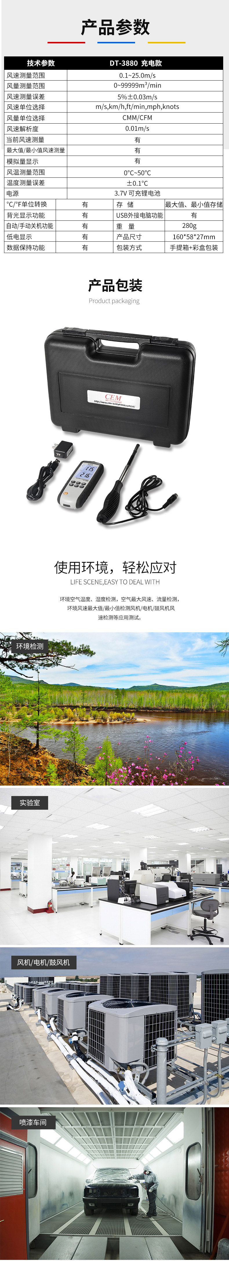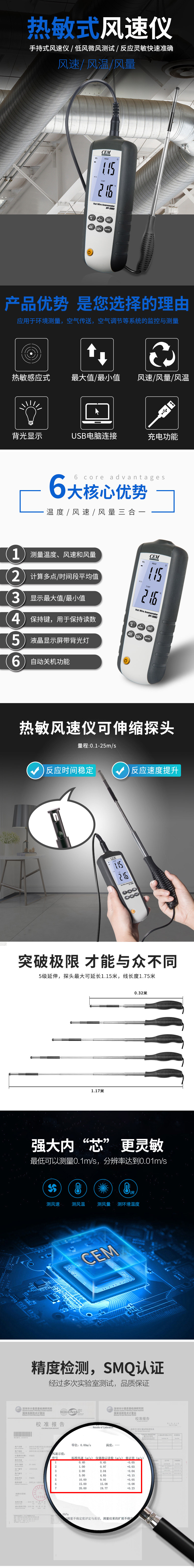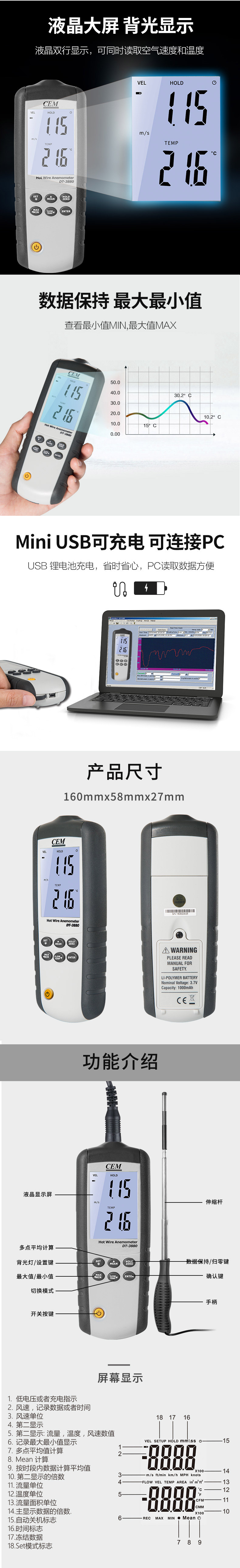 DT-3880熱敏式風速儀是CEM新推出的一款性能穩定、高精度、帶可充電鋰電池的熱敏式風速儀,1.5M的熱敏式探頭,可測量風速,風溫,風量以及環境溫度。在室內空氣、工業健康環境、管道、暖通空調等領域都能發揮準確測量的檢測功能。